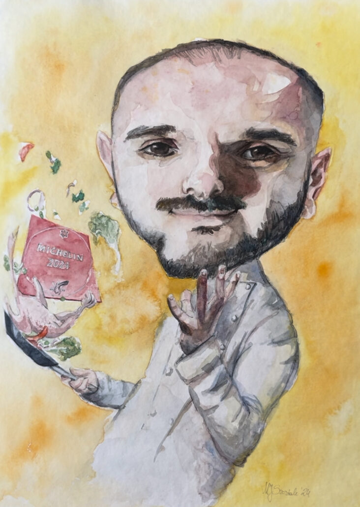 Specjalizuję się w karykaturze klasycznej rysowanej na żywo, z prędkością gołym okiem niedostrzegalną… Moim narzędziem zbrodni, ostrzejszym nawet od miecza, jest marker pędzelkowy – zawsze w zasięgu ręki, by użyć go wobec niczego nieświadomej ofiary. Ślady czarnego tuszu na kartce wyznaczają ścieżkę moich zabójczo precyzyjnych, acz eleganckich, ruchów. Powstająca w ten sposób impresja kradnie esencję modela,  bezlitośnie więżąc ją w formacie kartki A4 na długie lata.